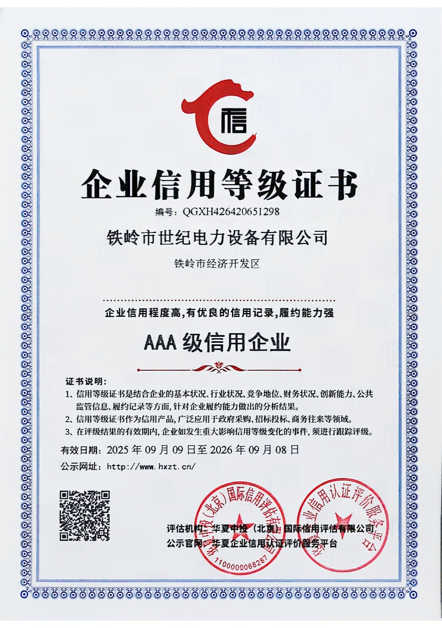 世紀(jì)電力AAA級(jí)信用證書